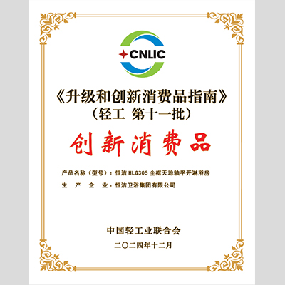 奖 项:升级和创新消费品指南(轻工第十一批)-恒洁HLG305全框天地轴平开淋浴房