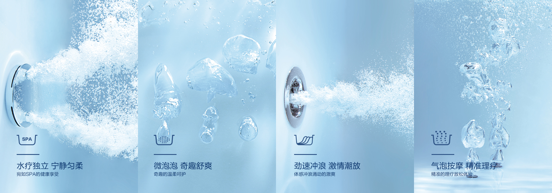 劲速冲浪按摩系统、微泡泡按摩系统及汽泡按摩系统四件模式供你选择,让你随心所浴,乐享水悦生活